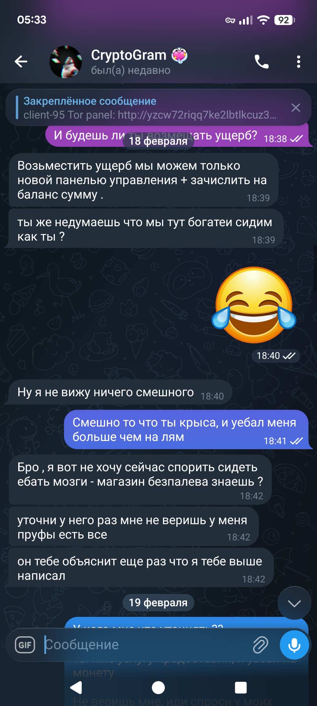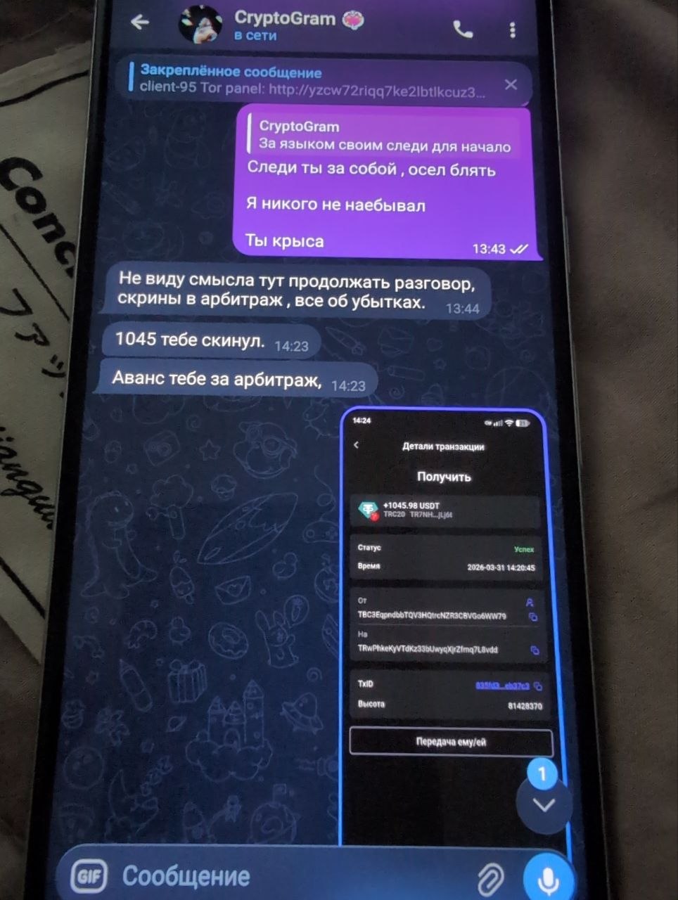 От себя пропишу , для понимания общественности:- я новичок на руторе, и в целом с техникой и прочим знаком мало. О том что такое арбитраж и как он делается, я узнал лишь два дня назад, после чего сразу связался с администрацией форума рутор и внёс платеж гаранту в размере 5% от заявленной мной суммы ущерба в 500к. С потерей своих денег и доверия клиентов, и прочих проблем которые доставил мне сервис Криптограм , я смирился . Хочу предостеречь всех пользователей кто работает или думает начать работать с данным сервисом, не делать этого, так как это дырявый и крысиный сервис, прошу прощения если не этично. Но вы останетесь без своих денег и товара и бизнеса.