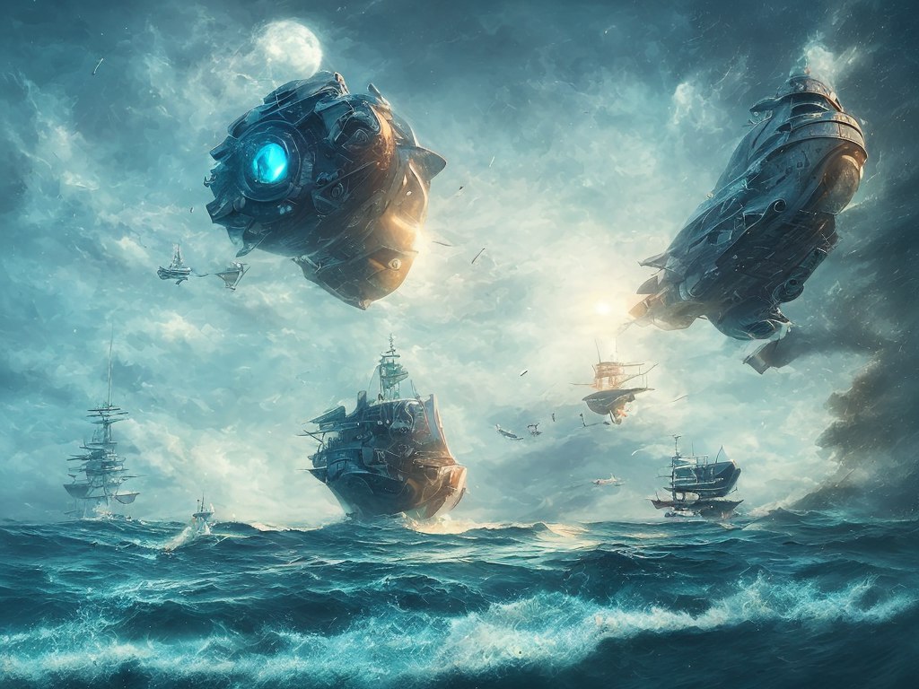 моё видинее футористического мира, в полностью поглощении земли водой, ебейшие корабли с летающими механизнимами и жизнью людей в них - перед переселением на другие планеты )))
