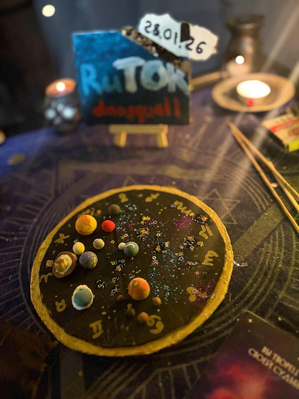 Я выбрала и сделала макет солнечной системы с тем, как будут располагаться планеты 17 февраля во время затмения, то есть архетип - затмение. Я родилась вблизи затмения и потому практически каждый коридор затмений меня как-то задевает. Особенно запомнилось прохождение затмений по оси отношений - Овен-Весы. Там были события... с одним парнем, с которым мы сами завязаны крепко-накрепко через затмения и обязаны были пройти путь вместе, длинный путь...