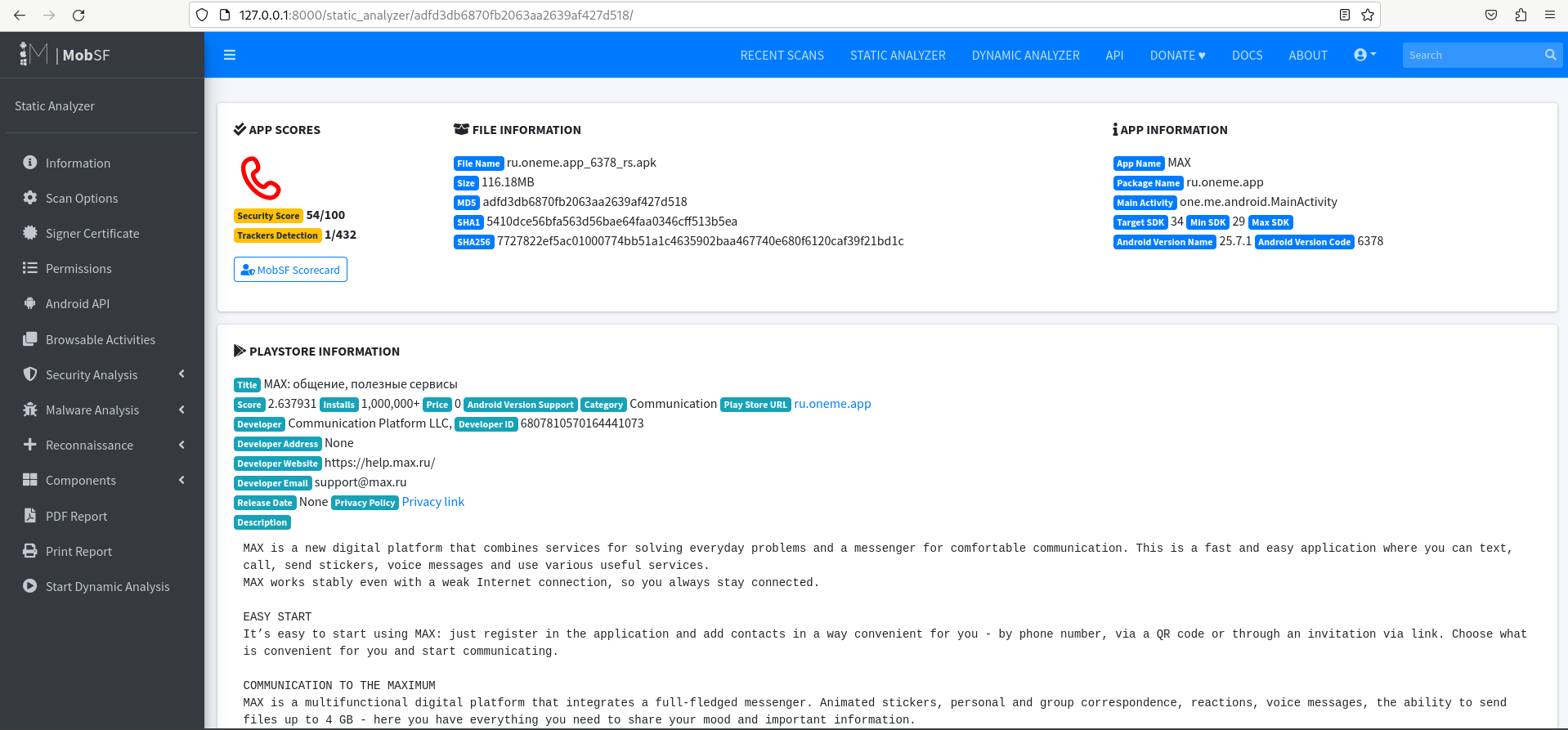 - MobSF выполнит серию автоматических тестов безопасности.