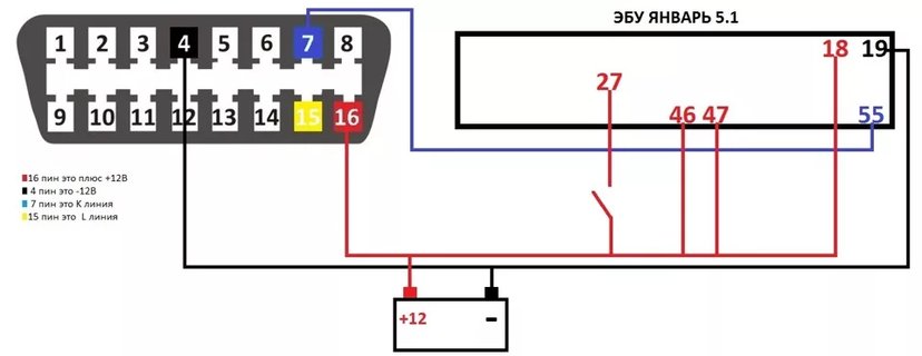 Переходник разъема OBD 2 на колодку ЭБУ январь 5.1