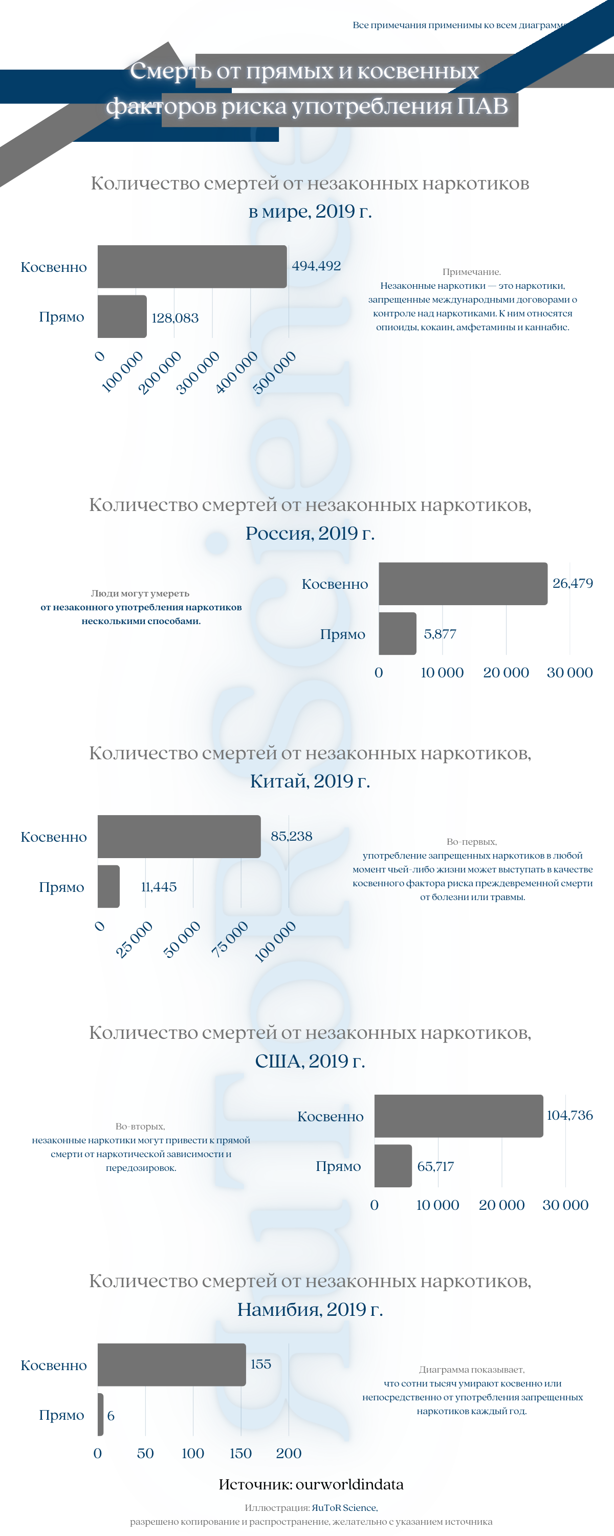 На 2019 год Россия не занимала первое место в мире по употреблению наркотиков. По данным ООН, в 2017 году около 271 миллиона человек в мире употребляли наркотики, что составляло 5,5% населения планеты в возрасте от 15 до 64 лет. Это было на 30% больше, чем в 2009 году. числа потребителей связан с увеличением употребления опиоидных препаратов в Африке, Азии, Европе и Северной Америке, а также каннабиса - в Северной и Южной Америках и в Азии.